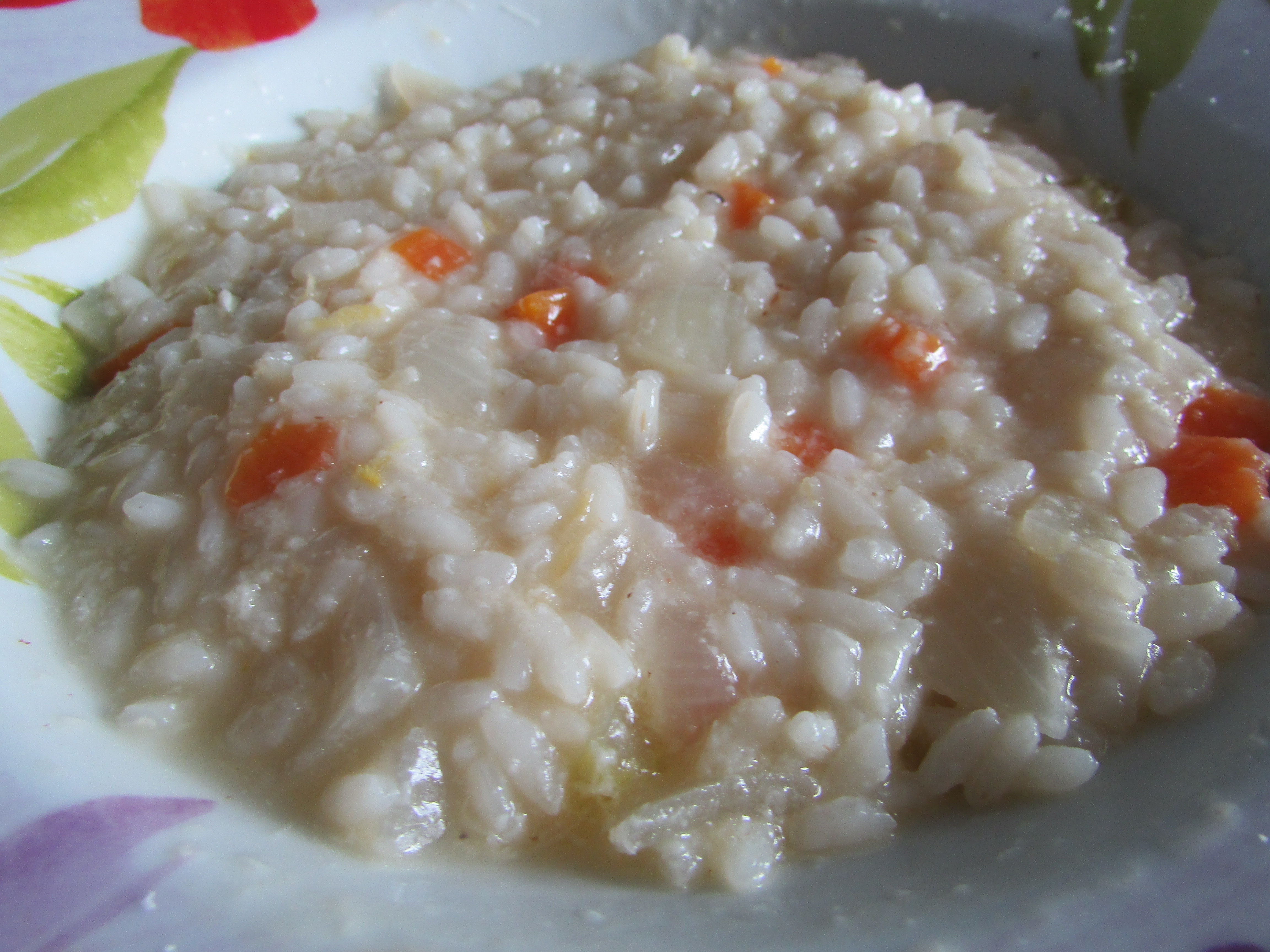 Ingrédients : 300 gr de riz, 1 gros citron, 1 orange 1 oignon, 20 gr de beurre, 1/2 verre de vin blanc, bouillon de légumes, un peu de ciboulette, parmesan râpé ....